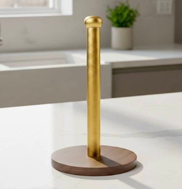 This paper towel holder is made from solid white oak and features a simple, clean design with a gold accent for a refined touch. Sturdy and functional, it’s designed for everyday use. It's finished with a rich dark walnut stain and fully sealed for durability.