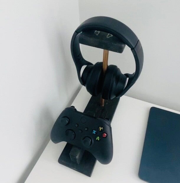 Handcrafted Wooden Gaming Controller & Headphone stand. Sturdy and functional, it’s designed for everyday use. It's finished with a rich dark walnut stain and a gold accent, plus it's fully sealed for durability. The headphones icon adds a nice touch!